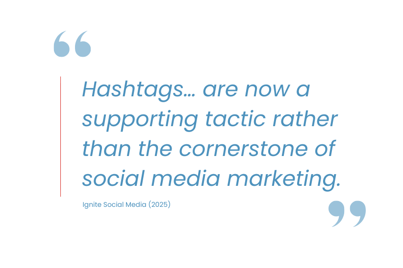Multiple industry sources now view hashtags as useful but secondary. Content Marketing Institute summarizes it well: “Hashtags still matter, but not like they used to… they’re supporting players in a bigger, better visibility strategy.” [1]