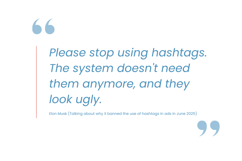 There are also shifts in platform policies. For instance, X banned hashtags in paid ads in June 2025, [4] although organic posts can still use them. This indicates a trend towards stylistic and platform maturity, even as organic tagging continues.